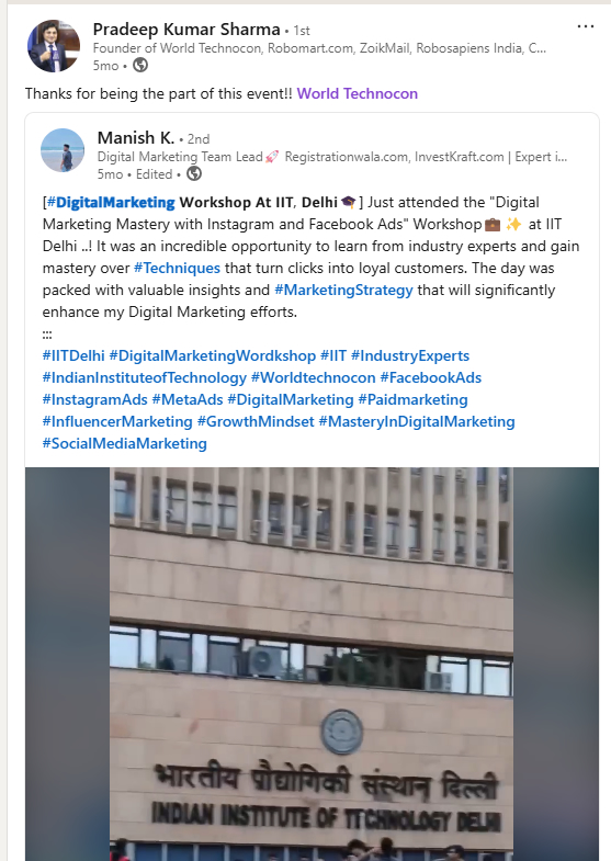 Unlock your potential at IIT Delhi with the World Technocon Workshop Series! Explore cutting-edge topics like AI, IoT, Digital Marketing, Machine Learning, and the Metaverse through hands-on sessions led by industry experts. Gain real-world insights, practical skills, and networking opportunities to stay ahead in the evolving tech landscape. Don’t miss this chance to learn, innovate, and grow at one of India’s top institutions!